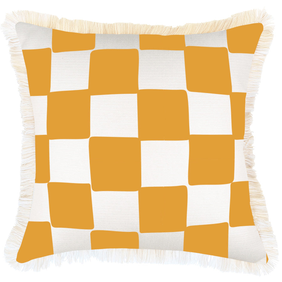 Cushion Cover Coastal Fringe Check Gold White 45cm x 45cm